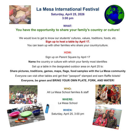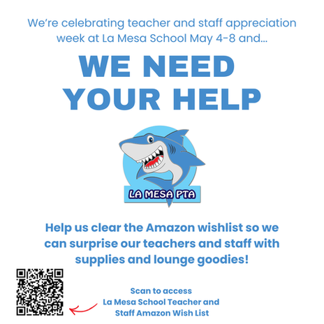 The La Mesa Parent Teacher Association (PTA) consists of parents, family members, friends, and teachers that are dedicated to serving the needs of La Mesa School, our students, and our unique community. We strive to create a warm and welcoming school environment where every child and family is supported and valued! We run fundraising campaigns, host exciting events, and participate in community outreach throughout the school year.